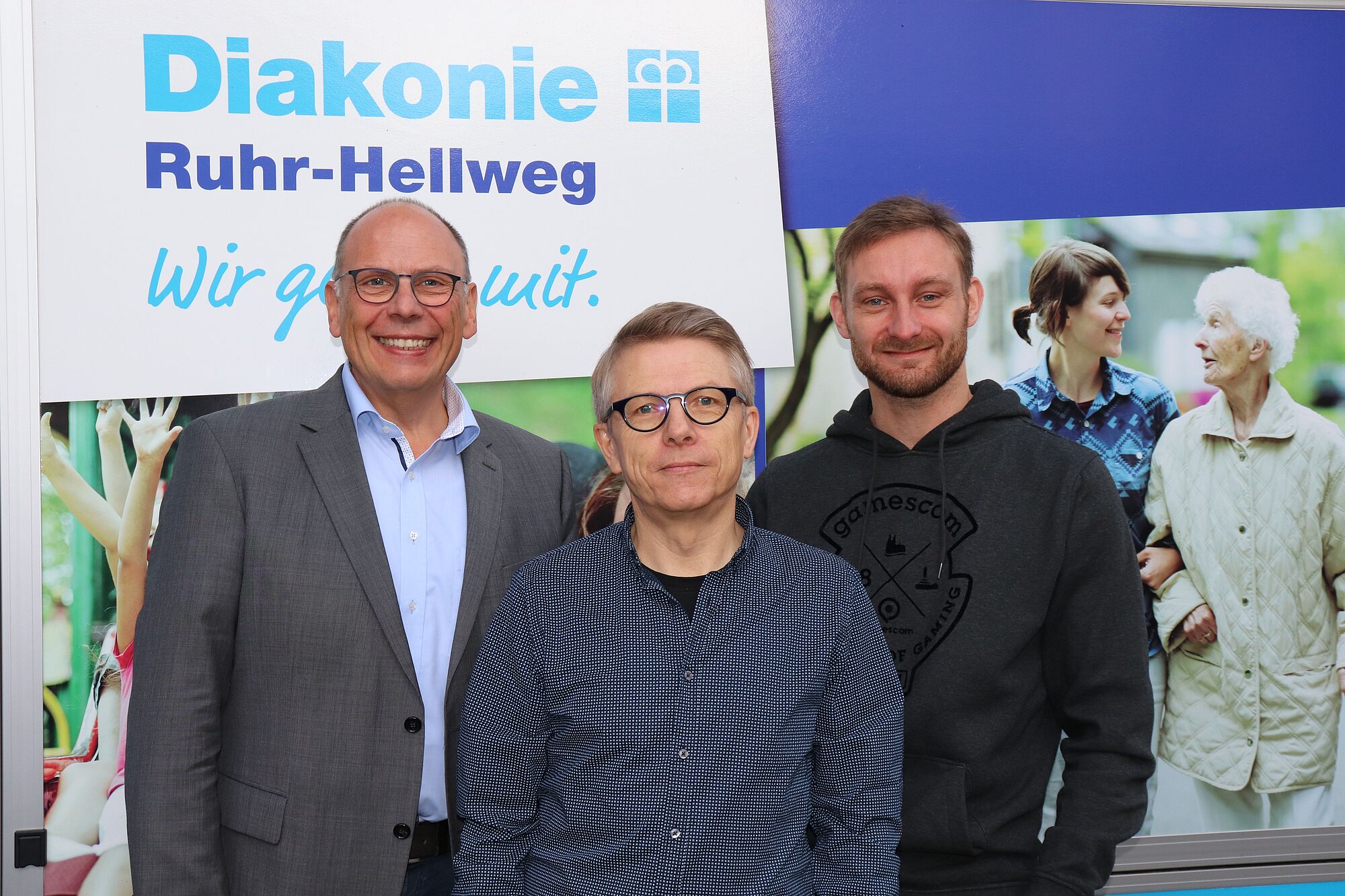 Ulrich Brauckmann (Mitte) ist neuer Leiter der Suchtberatung bei der Diakonie. Vorstand Christian Korte (links) und Christoph Straub, Fachbereichsleiter „Selbstbestimmtes Leben“, gratulieren. Foto: drh/Kathrin Risken