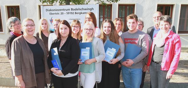 Für die Absolventinnen und Absolventen beginnt ein neuer Lebensabschnitt. Mit ihnen freuen sich unter anderem Diakonie-Vorstand Christian Korte (hinten rechts), Fachseminar-Leiterin Heike Brauckmann-Jauer (vorne rechts), Kursleiterin Ute Tamm (hinten links) und Sozialdezernentin Christine Busch (vorne links). Foto: drh