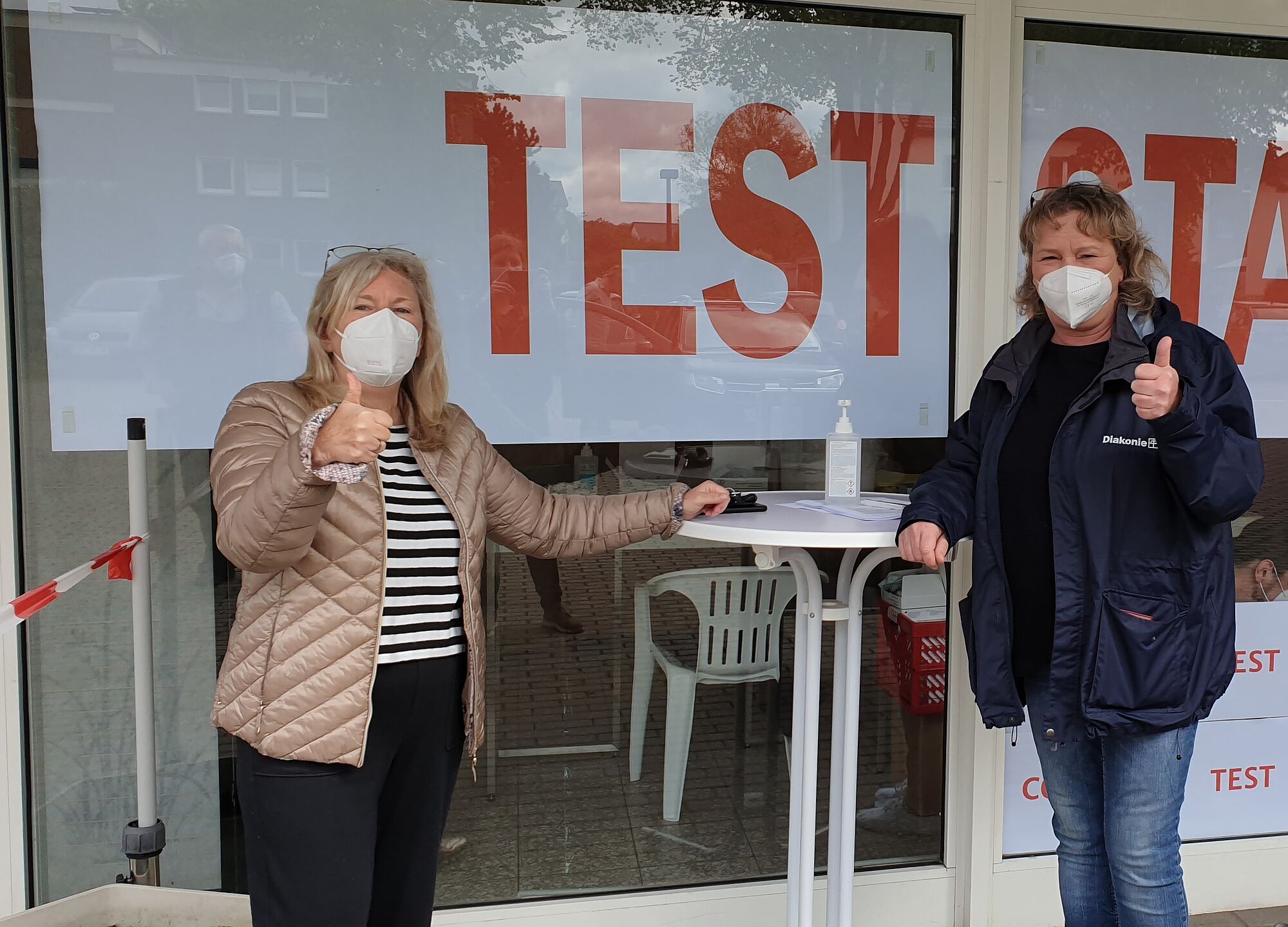 Christine Weyrowitz, Geschäftsführerin der Kaufnett gGmbH (links) und Martina Fuchs, Fachbereichsleiterin „Pflege und Gesundheit“, freuen sich über den Start der Teststation. Foto: drh