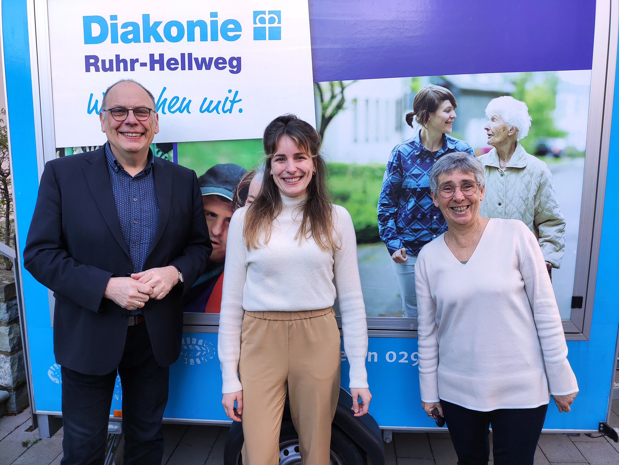Mayr tritt die Nachfolge von Susanne von Dolenga an, begrüßt wurde sie von der bis Mayrs Dienstantritt kommissarischen Leitung des Fachbereichs, Inge Nonte, und Diakonie-Vorstand Christian Korte.