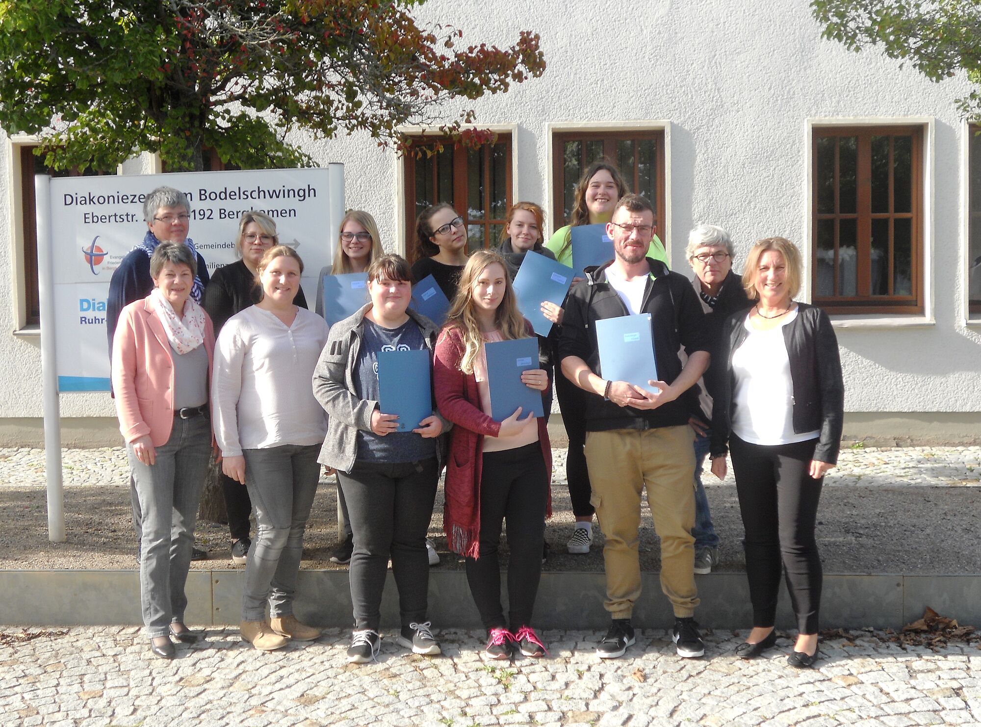 Das Fachseminar für Altenpflege der Diakonie hat neue Pflegehilfskräfte ins Berufsleben verabschiedet. Mit den neun Absolventinnen und Absolventen freuen sich Leiterin Heike Brauckmann Jauer (vorne, links) und das Dozententeam. Foto: drh